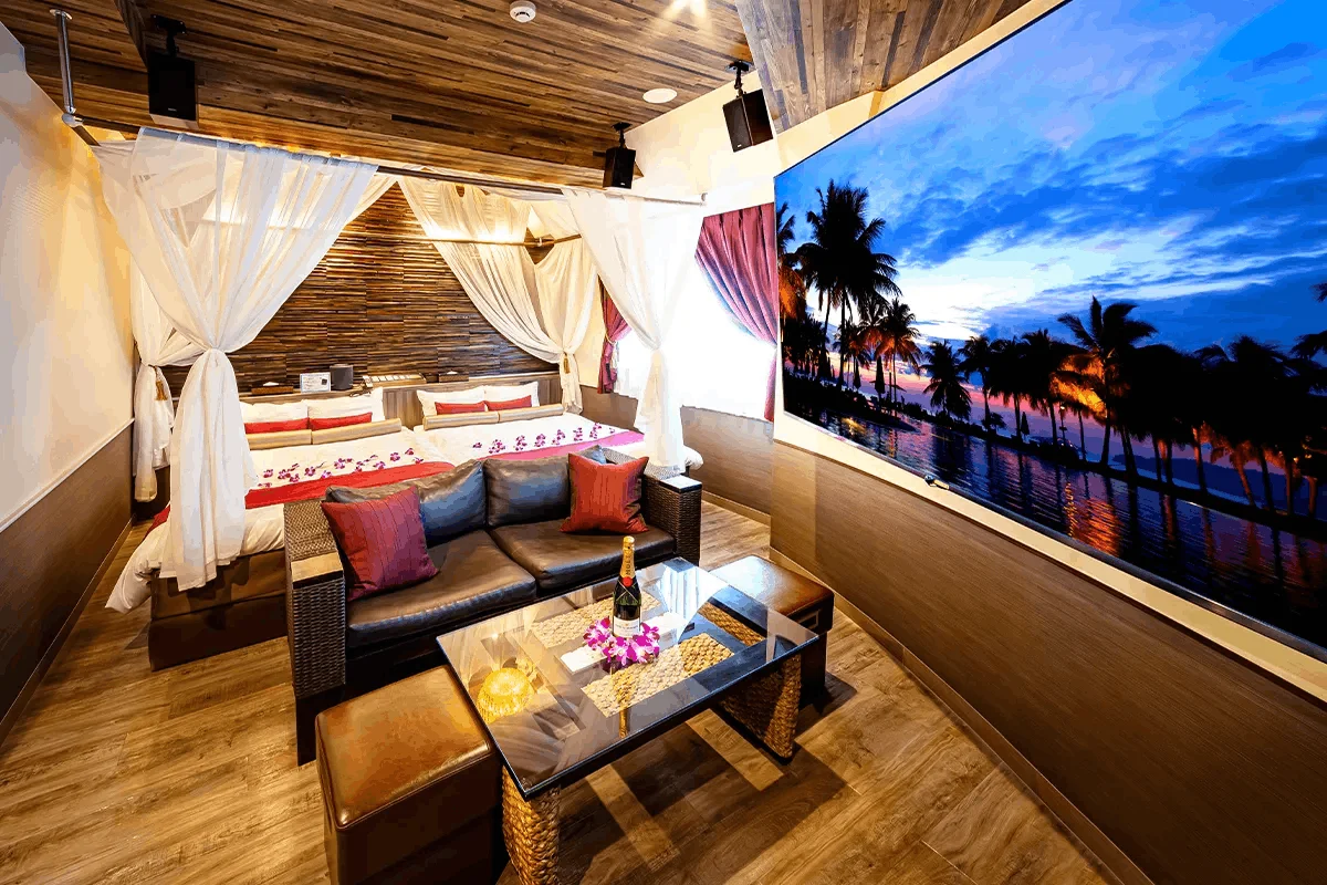 フォレスト池袋西口店最上位客室! 85インチ大型モニターと5.1chサラウンドシステム、200タイトル以上の映画や番組を視聴できるVODシステムを完備しております。